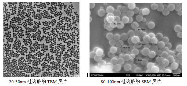 硅溶胶颜色一般为透明(小粒径)、半透明(中等粒径)、乳白(大粒径)。在电子显微镜下观察,硅溶胶中二氧化硅粒子的形状如下: